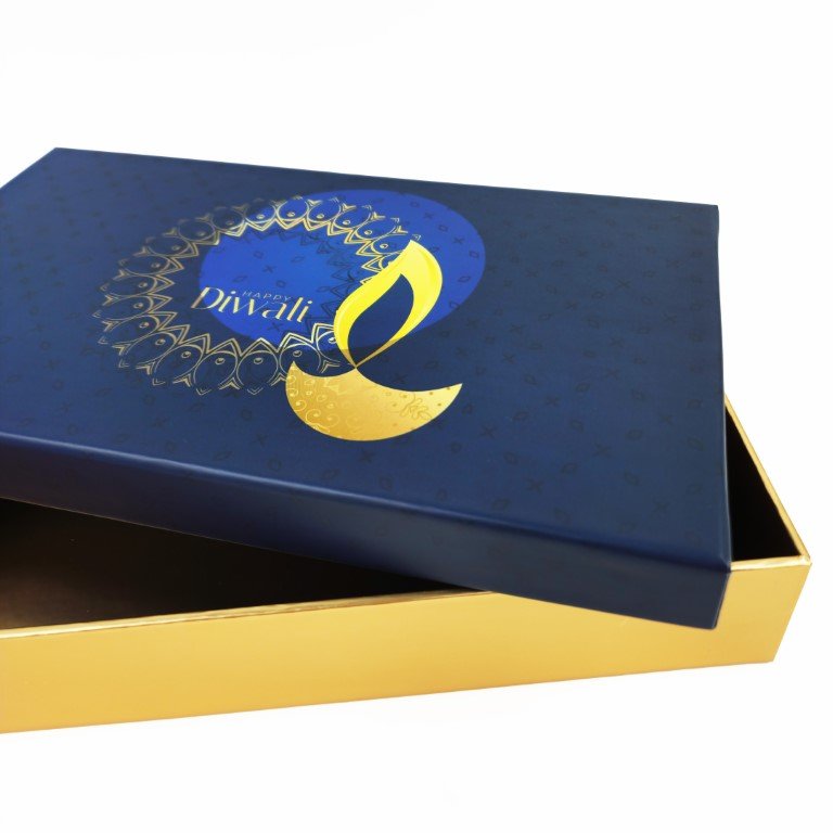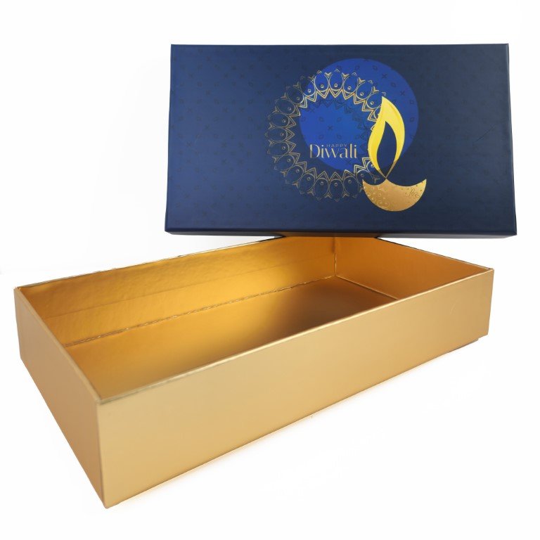 - Diwali-Themed Design: The top of the box features a vibrant blue Diwali design, while the bottom is wrapped in matt gold laminated paper, reflecting the festive colors of Diwali.