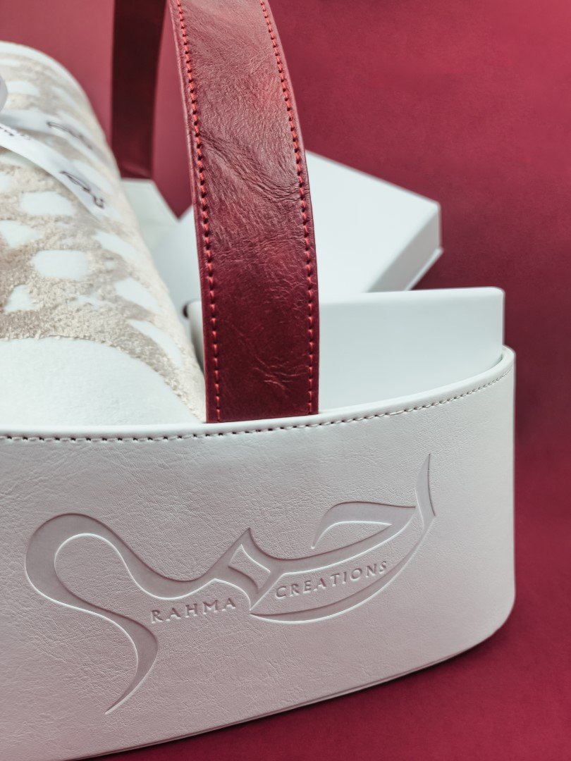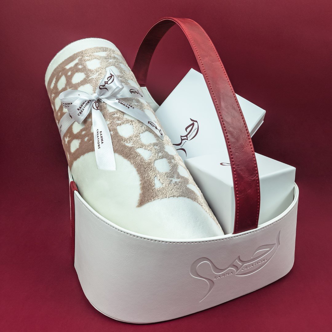 The gift hamper basket itself is crafted from white textured PU leather, with a handle made from maroon-colored leather and matching stitching. It’s not just beautiful but also practical for use.