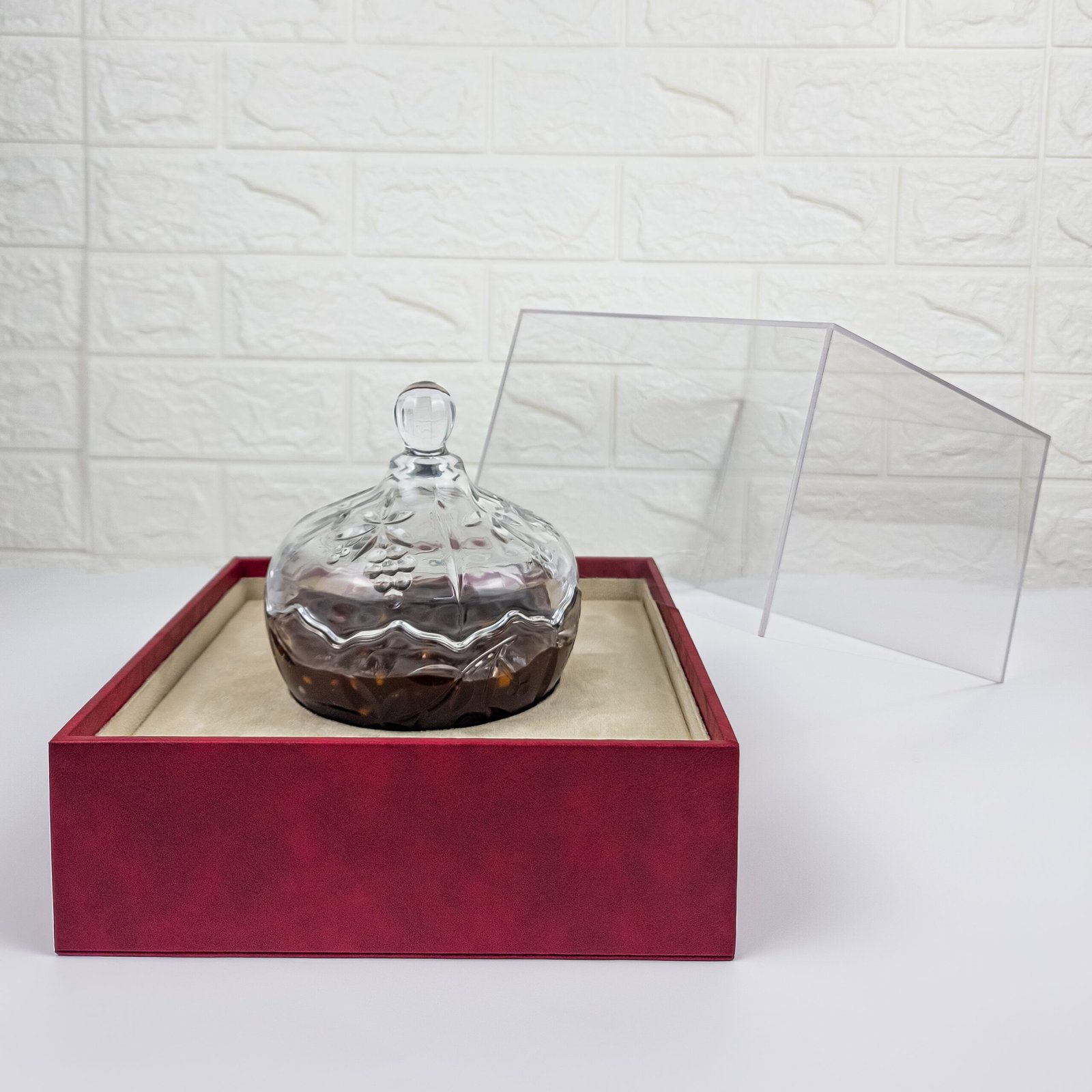 This elegant gift box is perfect for gifting Leather Halwa box, The box is made of high-quality MDF wood and wrapped in maroon leather. The inside is lined with beige suede fabric, creating a luxurious and elegant presentation. The box also features a clear acrylic lid, so you can easily see the contents inside.