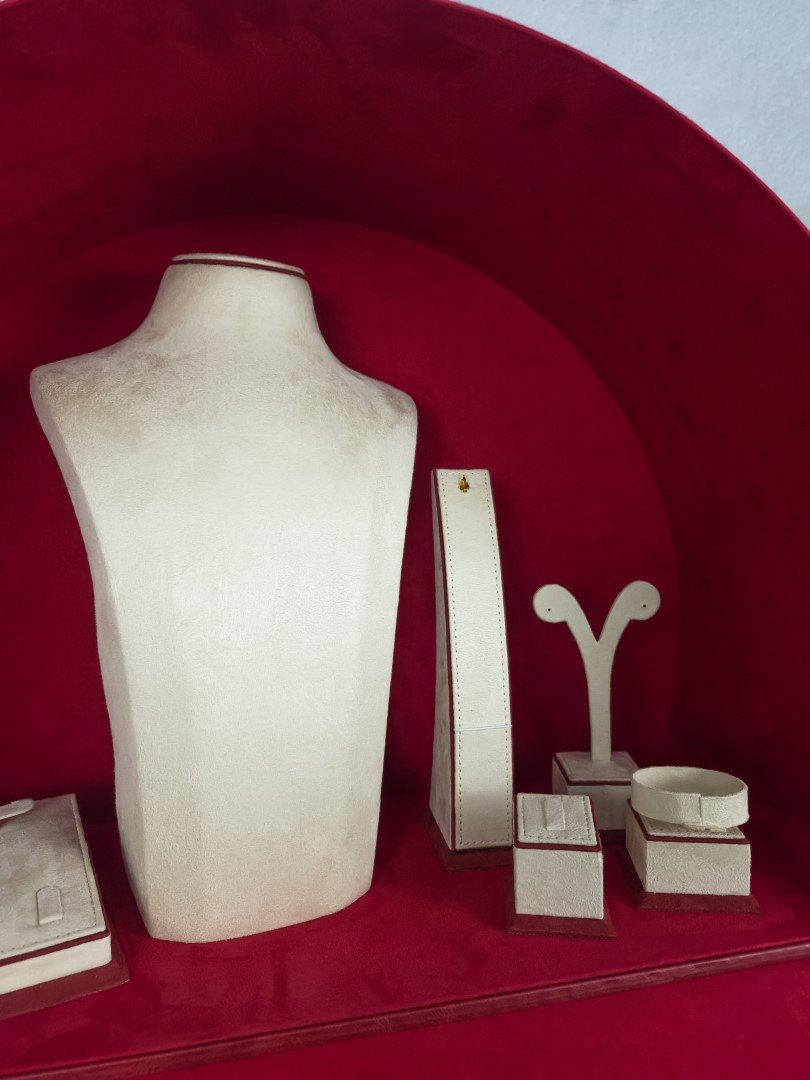 - Necklace holder: The large, beige mannequin in the center is used for displaying necklaces.
