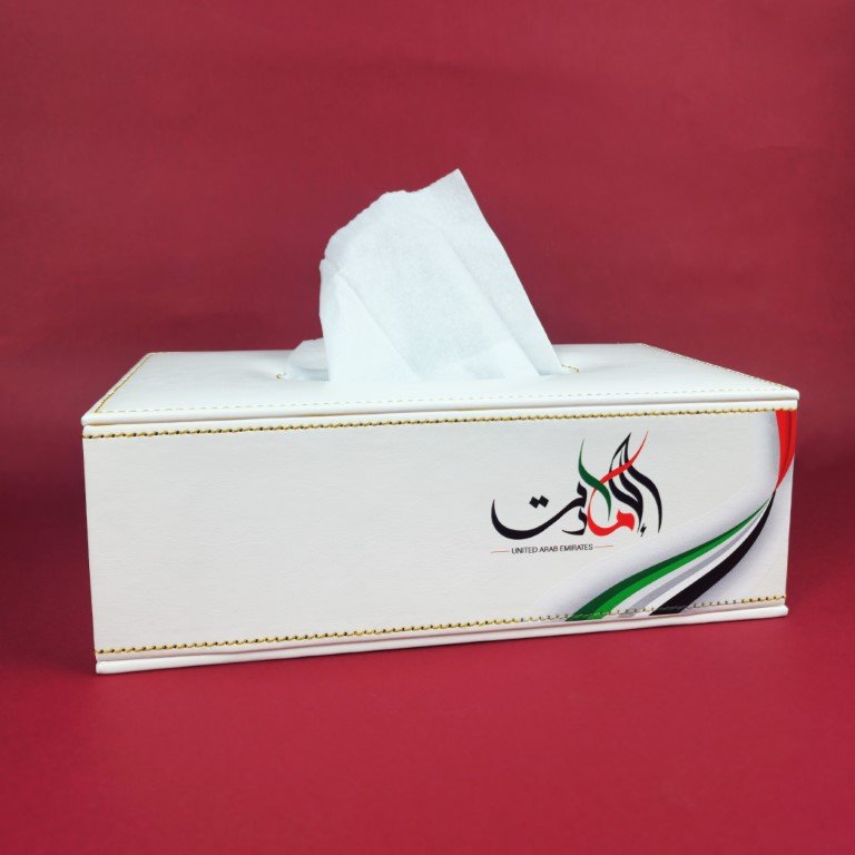 This leather tissue box holder with the UAE flag theme is a stylish addition to my office. The design is unique, and the leather quality is excellent.